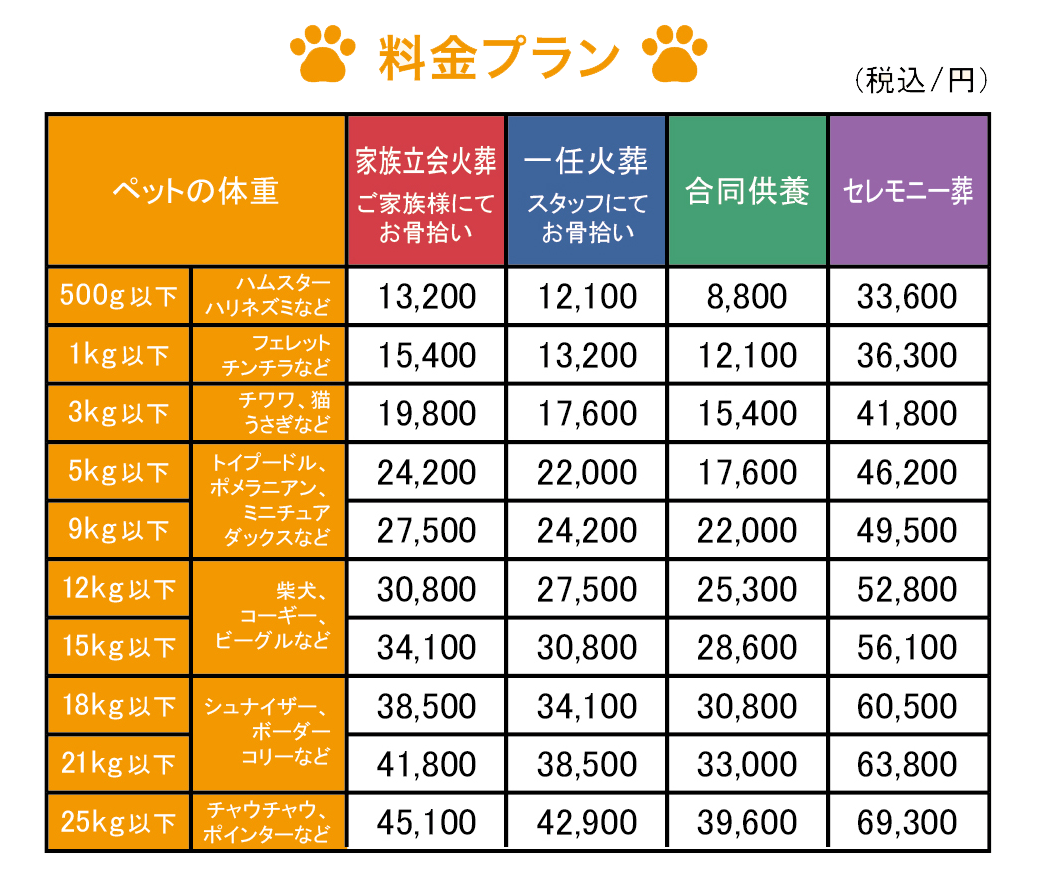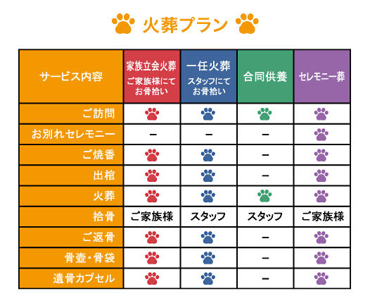 ご希望やご事情に合わせてお選びいただけるよう、火葬プランごとのサービス内容と料金を一覧でご案内しています。出張費、時間外料金、キャンセル料金は一切頂戴しておりません。表記はすべて税込となっております。
